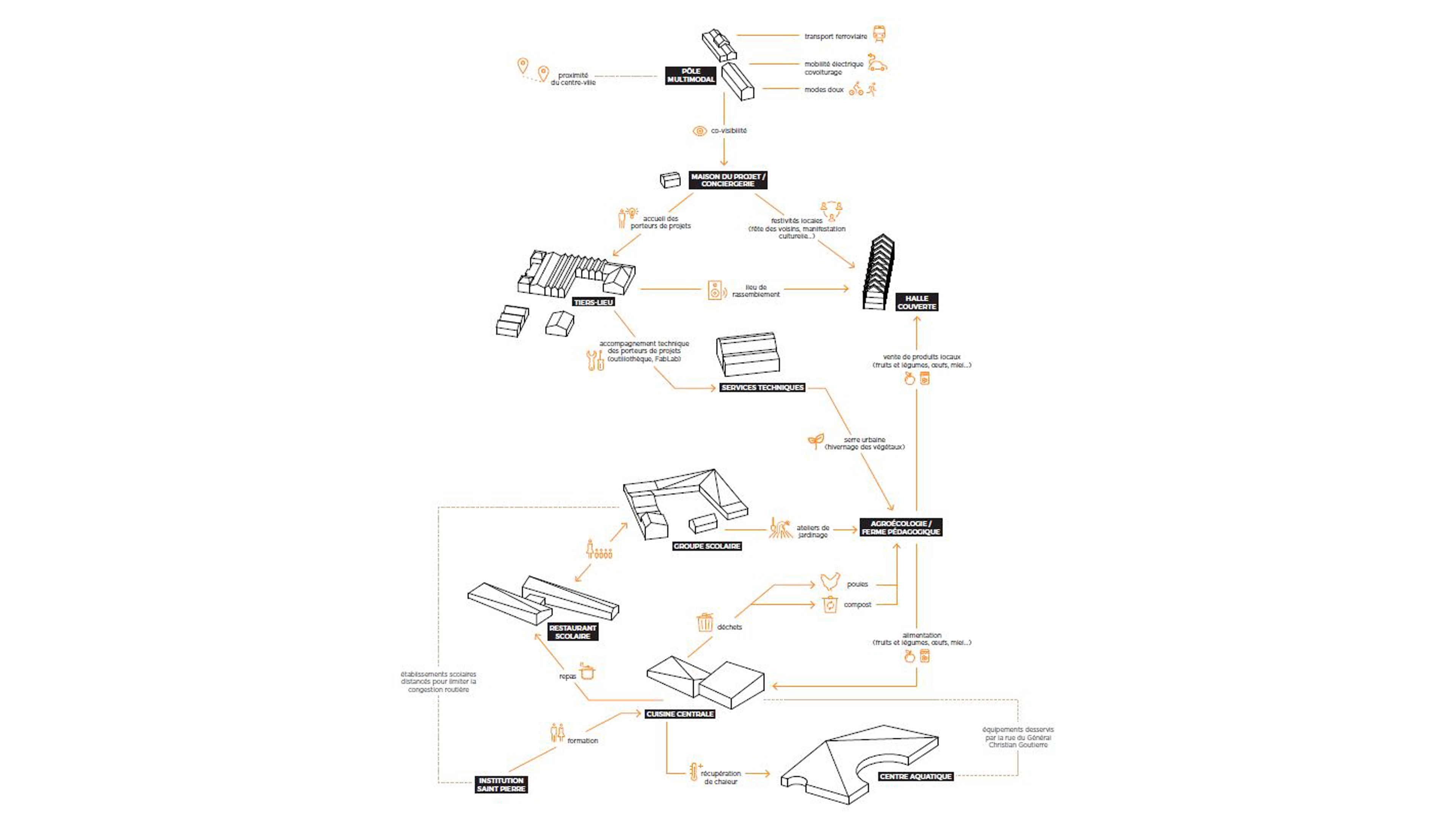 La trame verte constitue le liant du quartier, elle forme l’épine dorsale de la conception d’ensemble. Elle adopte des usages multiples et devient un élément autour duquel se rassemblent les équipements. La trame verte constitue le socle d’activités agricoles : production maraîchère, jardins familiaux, petits élevages, aquaculture… L’agroécologie urbaine est vecteur de transition énergétique : production alimentaire locale, biodiversité, sensibilisation à l’environnement.